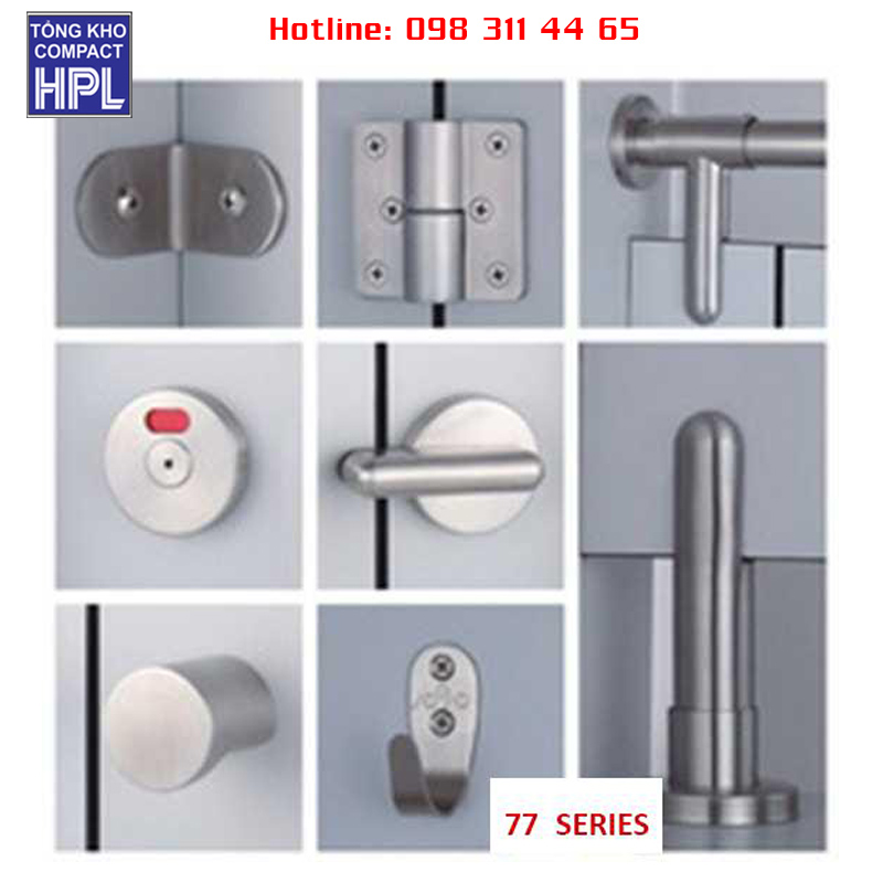 Một sản phẩm vách ngăn vệ sinh do hai bộ phận cấu tạo thành: Tấm compact hpl và bộ phụ kiện Inox. Phụ kiện vách ngăn compact được thiết kế dùng riêng cho vách ngăn vệ sinh.